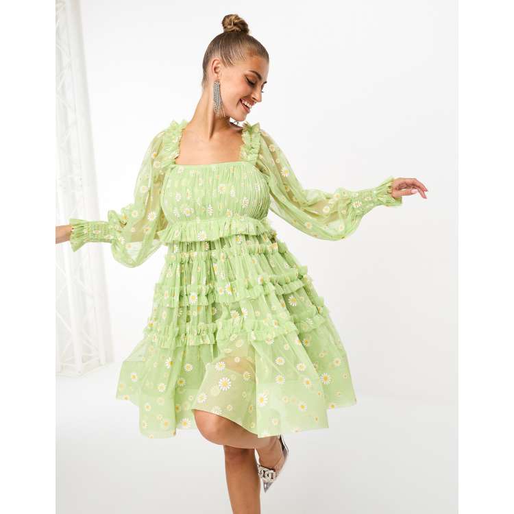 Lace Beads exclusive long sleeve tulle smock mini dress in green Very well made.