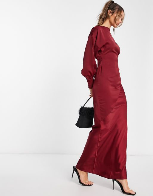 ASOS DESIGN Bridesmaid pleated long sleeve maxi dress with satin wrap waist in burgundy Very well made.