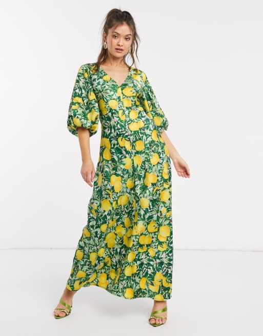 ASOS DESIGN satin trapeze maxi dress with puff sleeves in lemon print Very well made.