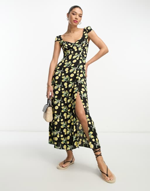 ASOS DESIGN viscose sweetheart neckline split front midi dress in lemon print Very well made.