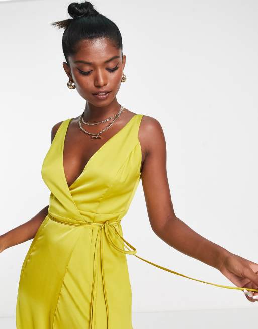 ASOS DESIGN satin wrap maxi dress with self tie waist in gold Very well made.