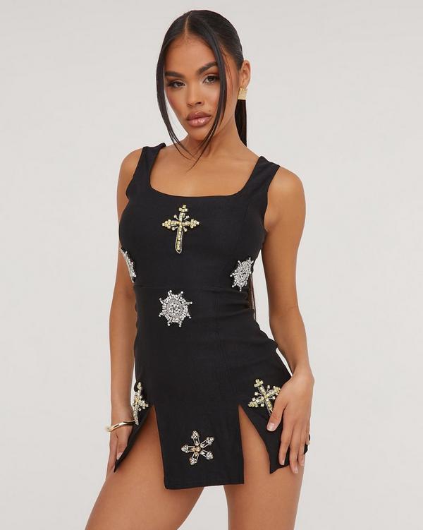 Square Neck Embellished Crucifix Detail Split Leg Mini Dress In Very well made.