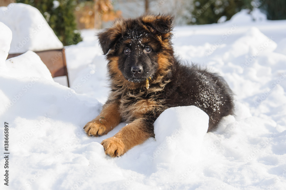 Small and cute german shepherd puppy in snow on sunny winnter day Very well made.