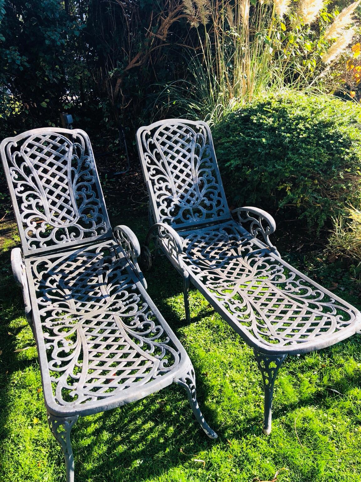 Wrought cast iron sun loungers with cushions in UB10 Hillingdon Very well made.