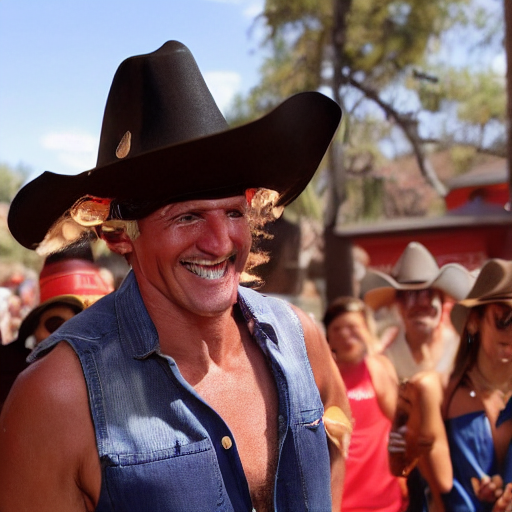 prompthunt a man wearing a very tall cowboy hat with a big grin Very well made.