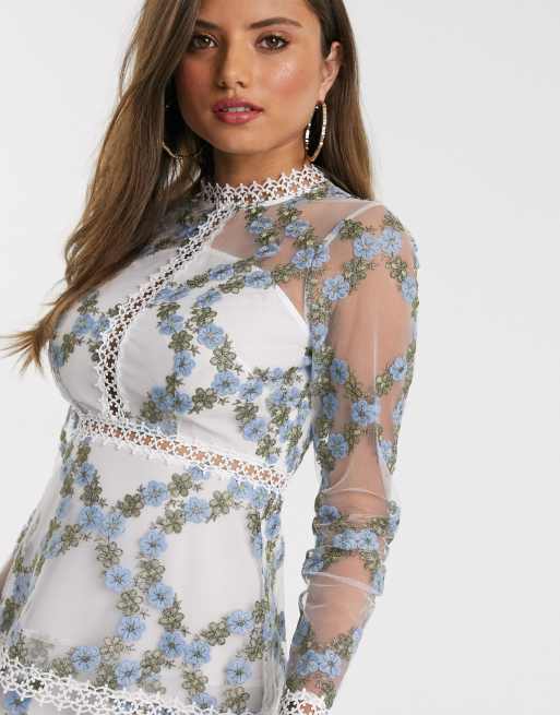 ASOS DESIGN long sleeve tiered mini dress in blue embroidered floral mesh in white base Very well made.