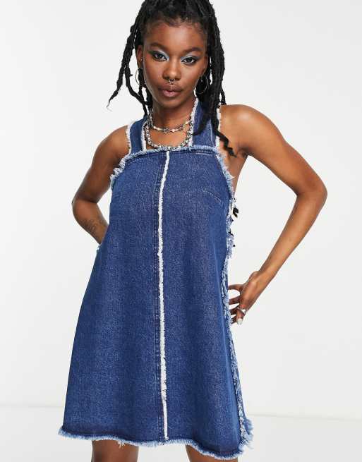 COLLUSION frayed hem cross back denim dress in dark blue ASOS Very well made.