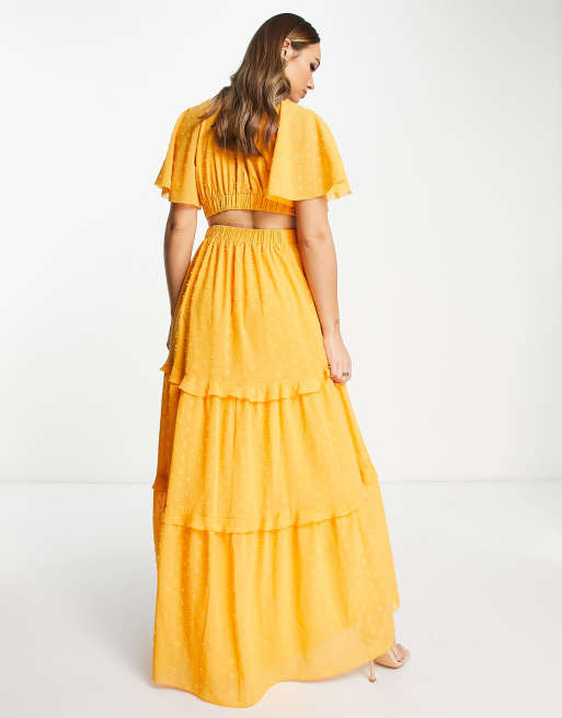 ASOS DESIGN angel sleeve plunge dobby tiered maxi dress with cut out and rouleux detail in mustard Very well made.