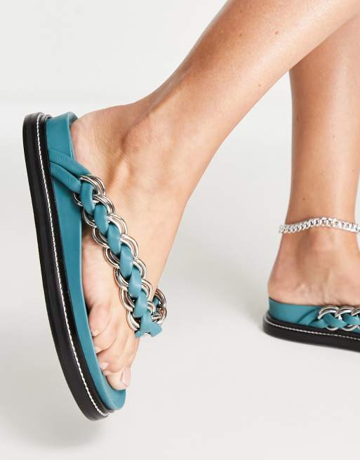 ASOS DESIGN Festive premium leather chain flat sandals in teal ASOS Very well made.