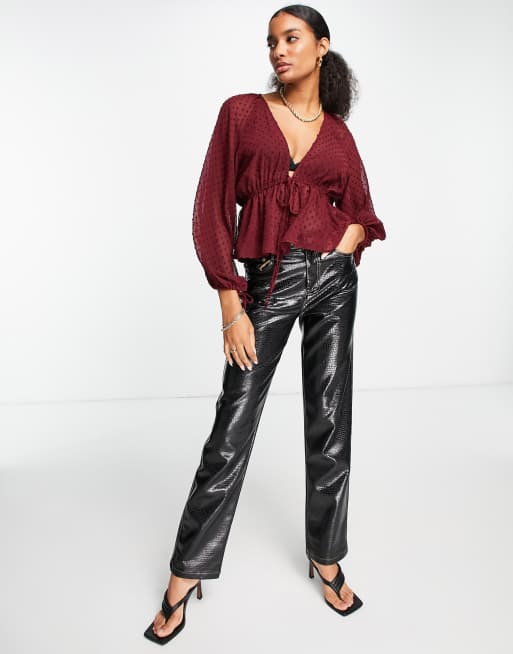 ASOS DESIGN tie front dobby blouse in berry ASOS Very well made.