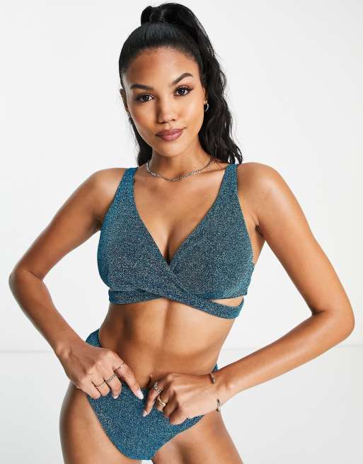 ASOS DESIGN Fuller Bust mix and match underwire wrap bikini top in blue glitter Very well made.