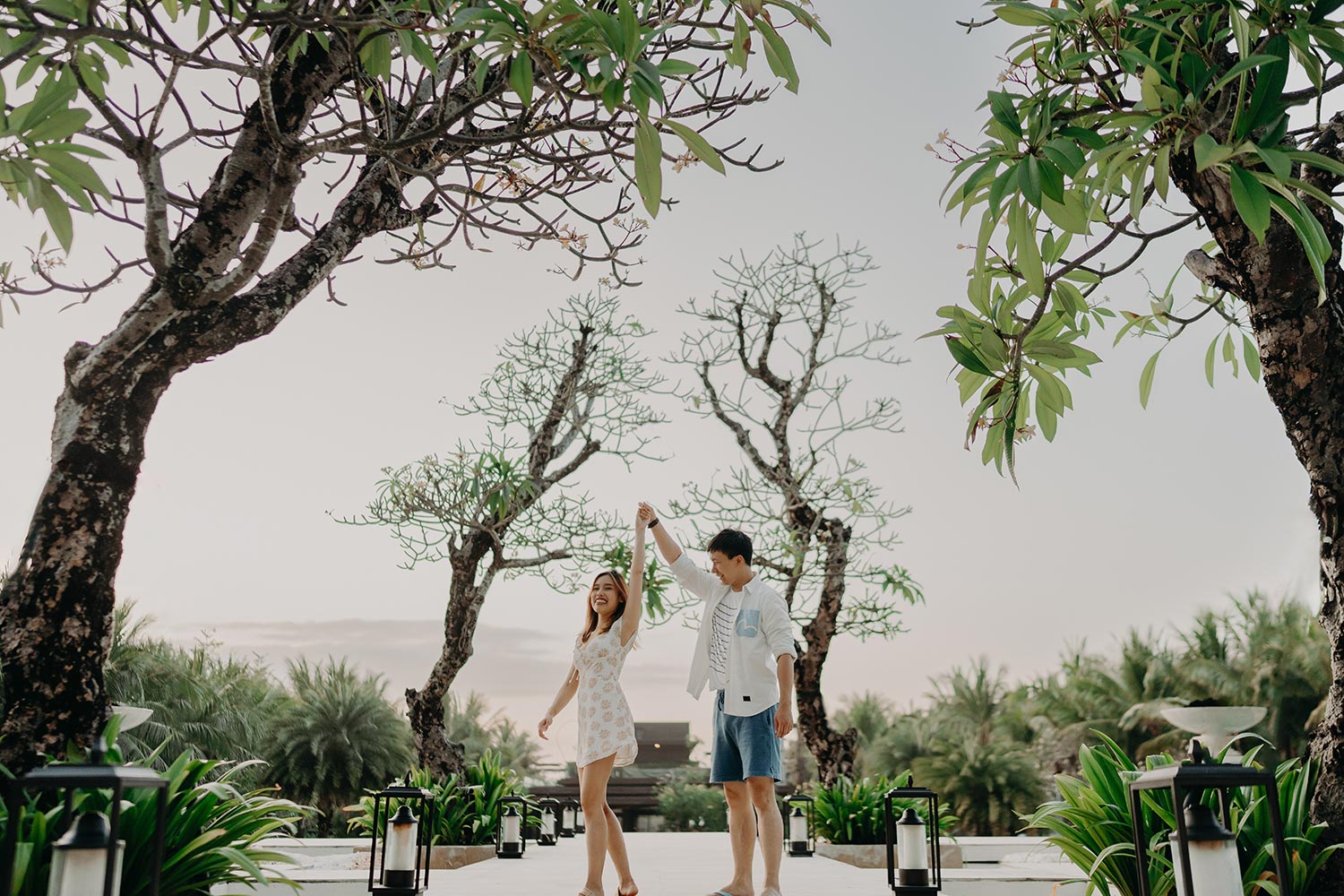 Steffy and her boyfriend, a lovely couple from Hong Kong, chose to celebrate their Bali holiday with a simple and casual couple photoshoot. Rather than something overly styled, they wanted their photos to feel natural, relaxed, and true to who they are—just two people enjoying time together. Their photoshoot took place at their hotel, The Apurva Kempinski Bali, where they spent a peaceful afternoon strolling on the grass, sitting under palm trees, and walking hand in hand along the beach as the sun slowly set.